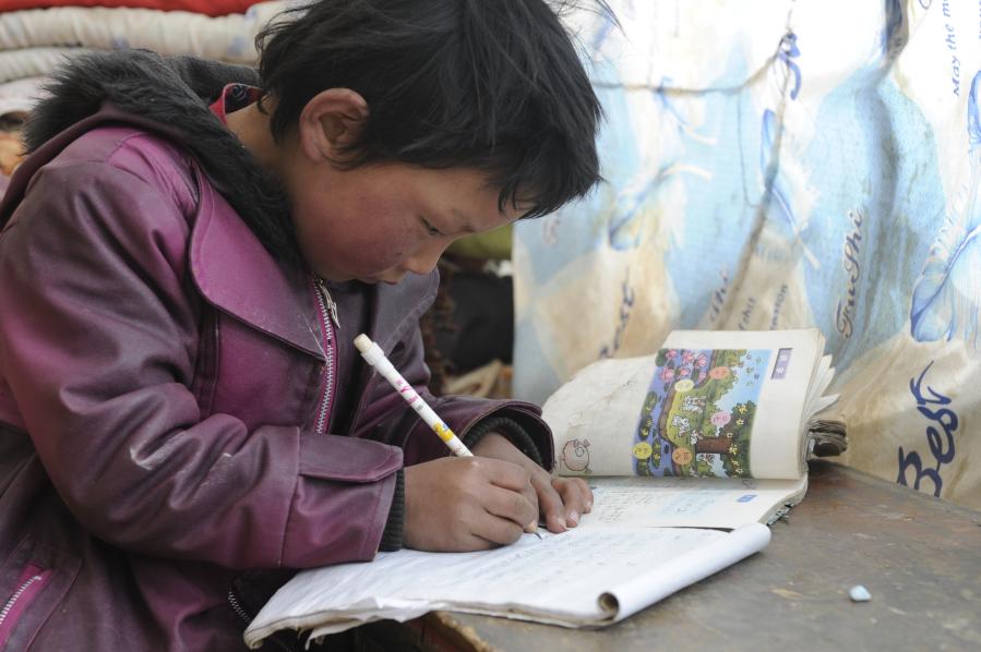 西藏雙湖縣嘎措鄉(xiāng)的一名學生在家中寫作業(yè)(2013年1月7日攝)。新華社記者 覺果 攝