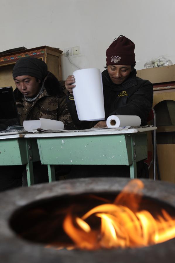 西藏雙湖縣嘎措鄉(xiāng)的干部在開會時用牛糞爐子取暖(2013年1月7日攝)。新華社記者 覺果 攝
