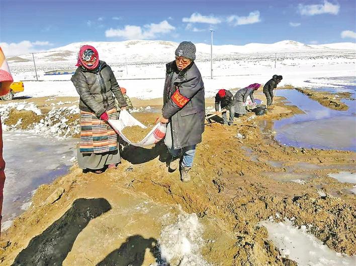 駐村期間,羅布頓珠(左二)同村民一起對嚴重影響農(nóng)牧民生產(chǎn)生活的滲水口進行了堵截。 中國電信西藏公司供圖