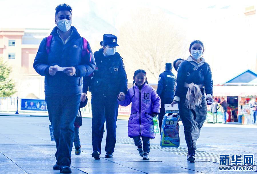 1月10日,“女子格?;ā本M民警在拉薩火車站帶領(lǐng)小旅客出站。新華社發(fā)(胡安鵬、黃飛攝影報道)