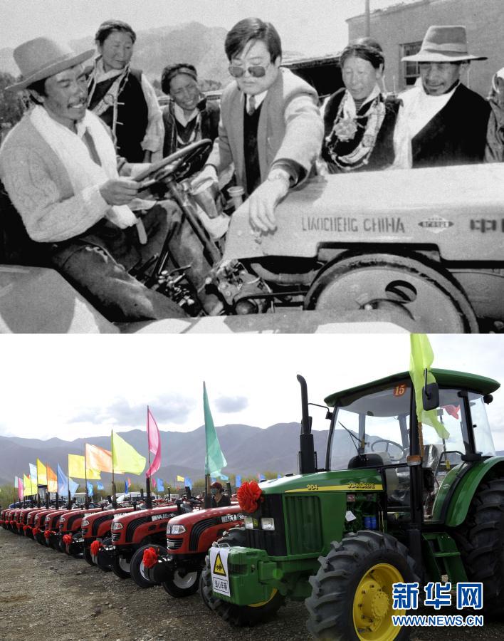 拼版照片:上圖是1996年,山東省援助西藏的首批農機物資日前抵達日喀則。圖為山東援藏干部在給當地藏族農民講解農機具的使用方法(新華社記者 土登 攝);下圖是2012年5月4日,西藏日喀則市白朗縣成為西藏自治區(qū)第一個農業(yè)機械化示范縣。圖為停放在白朗縣田間的農業(yè)機械(新華社記者 多吉占堆 攝)。新華社發(fā)