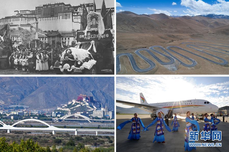 拼版照片:左上是1954年12月25日,康藏(今川藏)、青藏兩條公路勝利通車到拉薩。圖為在布達拉宮前舉行的盛大通車儀式(資料照片);左下是青藏鐵路列車抵達拉薩(2016年6月27日新華社記者普布扎西 攝);右上是通往珠峰的公路(2017年5月19日新華社記者普布扎西 攝)右下是西藏航空有限公司正式通航(2011年7月26日新華社記者 覺果攝)新華社發(fā)