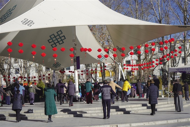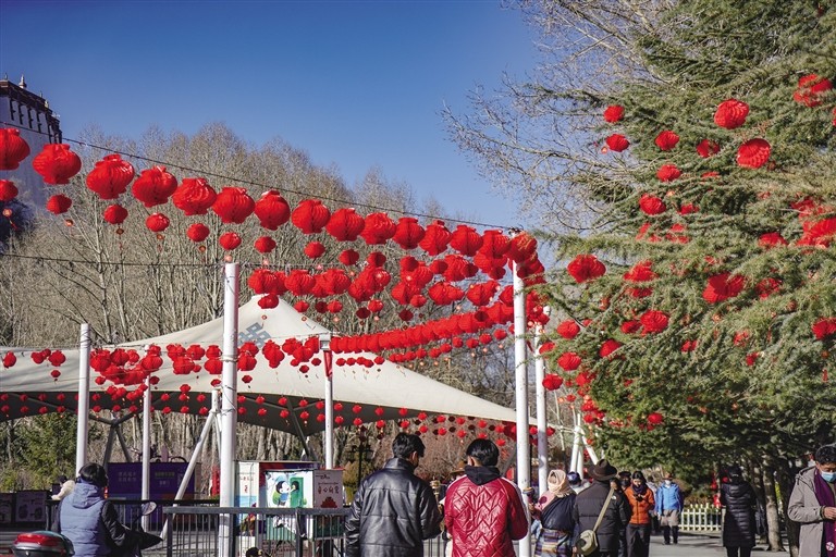 “日喀則新年已經(jīng)開始,但我因為工作原因沒能回去。今天過來公園散步,看到掛著的紅燈籠,一下子就有年味了,感覺公園都變得更漂亮了?!眮碜匀湛t市江孜縣的白瑪央金說。