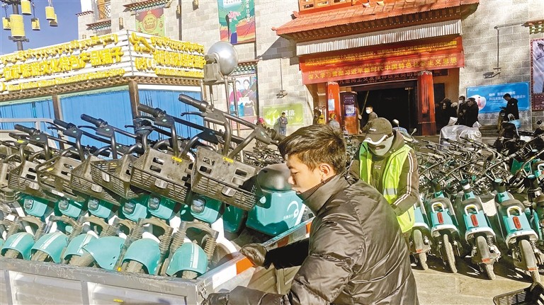 “叮……歡迎使用共享電動車,請在運營區(qū)內(nèi)騎行,請慢點,注意安全?!惫蚕黼妱榆囋诶_市的落地投放,有利于緩解市民停車難、出行難壓力,助力城市智慧交通建設(shè)。在拉薩萬達廣場門口,工作人員正將共享電動車擺放整齊,并用酒精擦拭消毒。