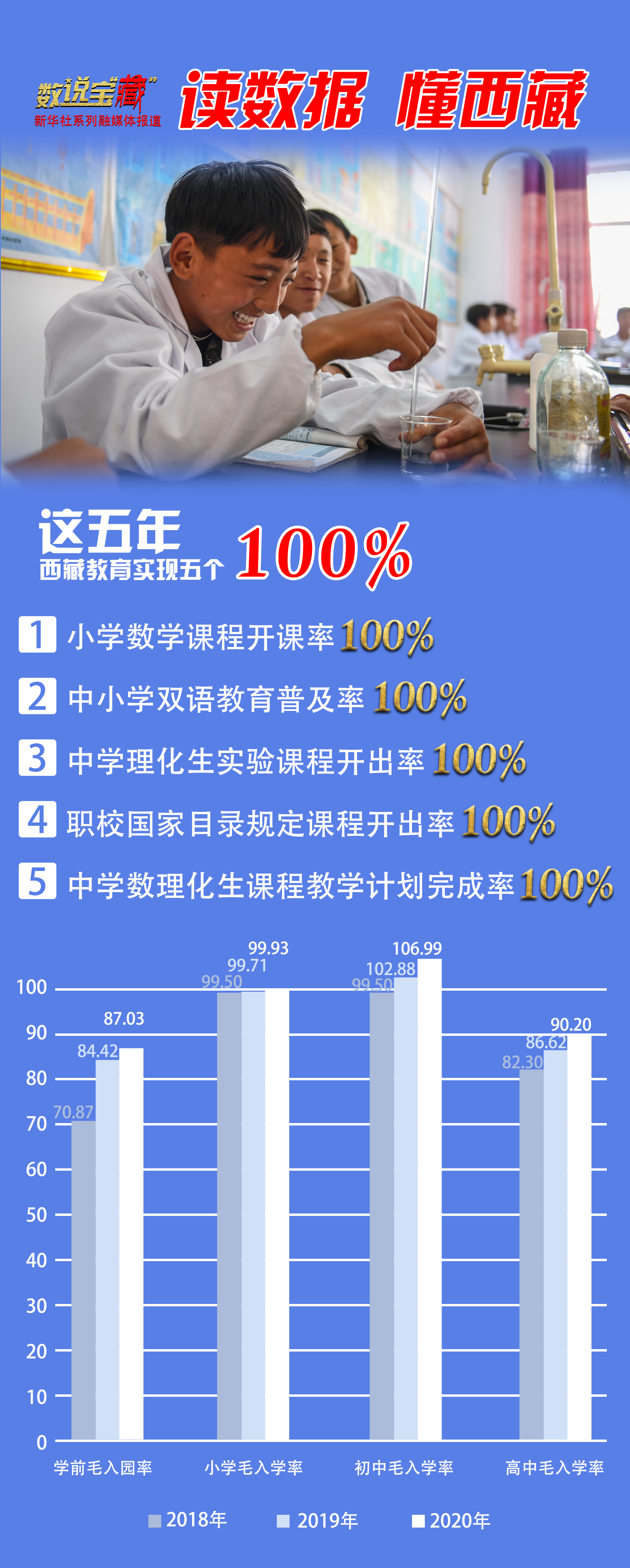 西藏自治區(qū)教育廳公布的數(shù)據(jù)顯示:“十三五”時期,西藏教育“五個100%”全面實現(xiàn),即中小學雙語教育普及率100%,小學數(shù)學課程開課率100%,中學數(shù)理化生課程教學計劃完成率100%,中學理化生實驗課程開出率100%,職業(yè)技術(shù)學校國家目錄規(guī)定課程開出率100%。