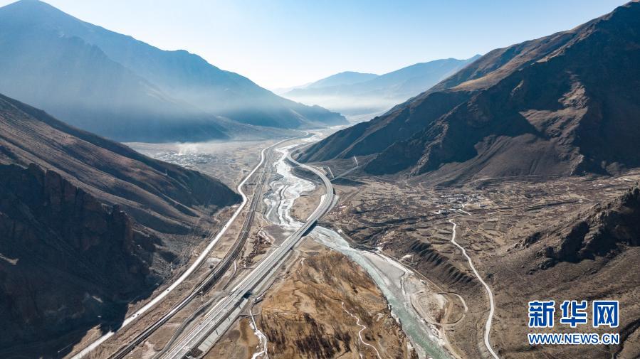 這是拉薩至那曲高等級(jí)公路(右)和青藏鐵路沿線風(fēng)光(1月28日攝,無(wú)人機(jī)照片)。新華社記者 晉美多吉 攝