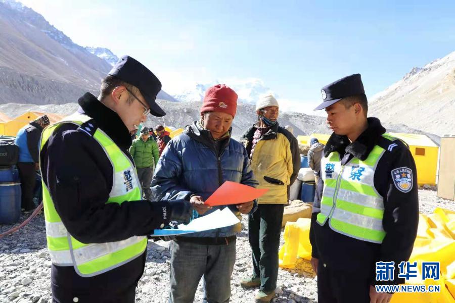在珠峰大本營(yíng)執(zhí)勤點(diǎn),民警開(kāi)展普法宣傳(2月攝)。新華社發(fā)(鄭勁松 攝)