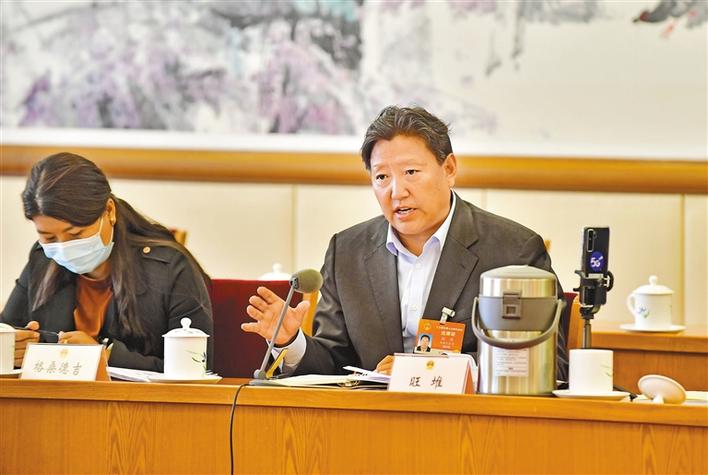 圖為全國(guó)人大代表旺堆在十三屆全國(guó)人大四次會(huì)議西藏代表團(tuán)全體會(huì)議上發(fā)言。記者 旦增西旦 攝