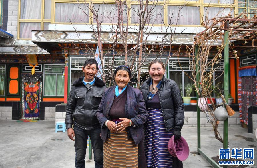 達(dá)娃(中)和女兒、兒子在自己的藏式院落前合影(3月15日攝)。新華社記者 晉美多吉 攝