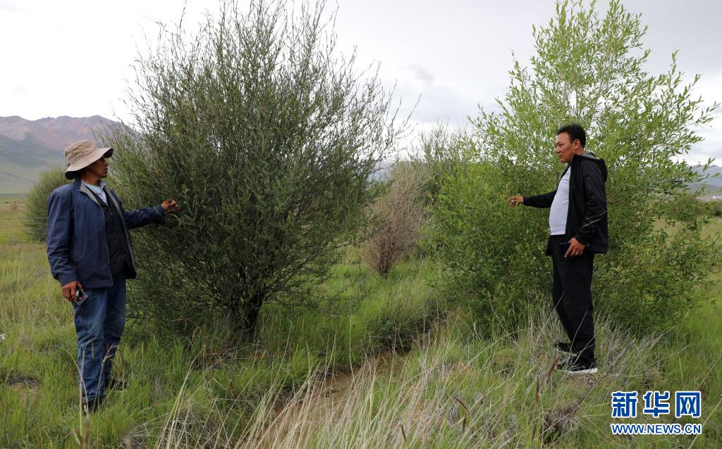索朗羅布(右)在檢查樹的長勢(2020年8月8日攝)。新華社記者 覺果 攝