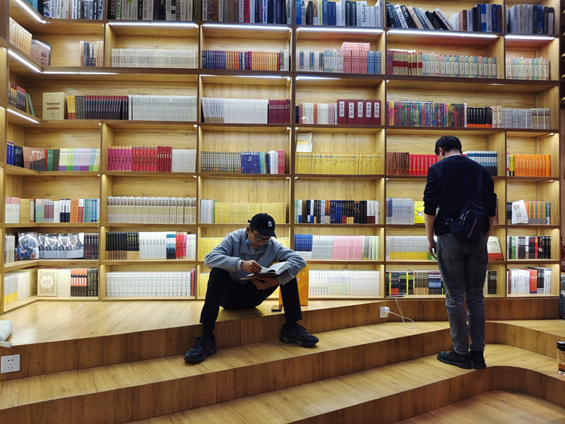 傍晚7點,在萬達(dá)廣場的“央喜書吧”里,與朋友約好吃飯的市民拉姆趁著朋友還沒到,抽空選購著書籍;