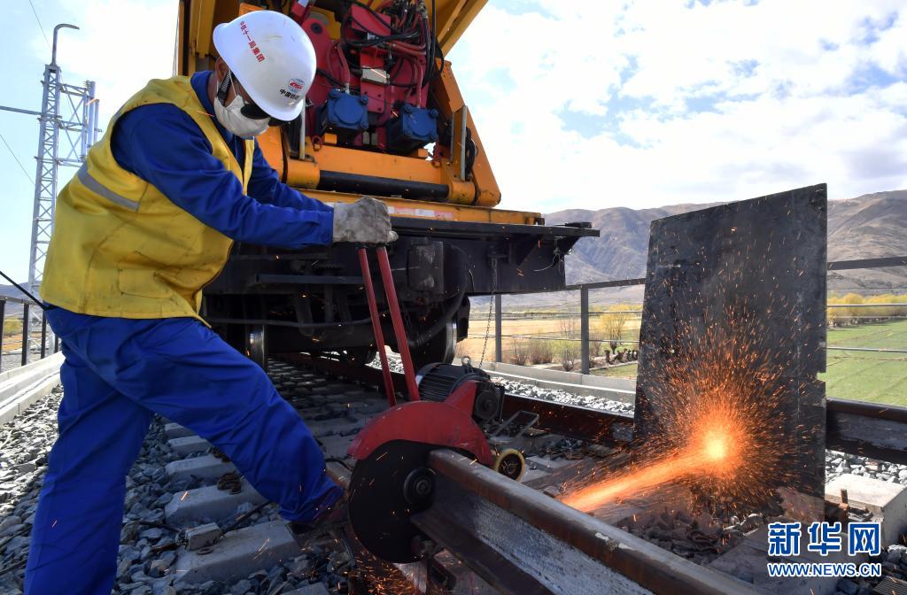 中鐵十一局工人在川藏鐵路拉薩至林芝段進(jìn)行長鋼軌無縫焊接作業(yè)(2020年4月16日攝)。新華社記者 覺果 攝