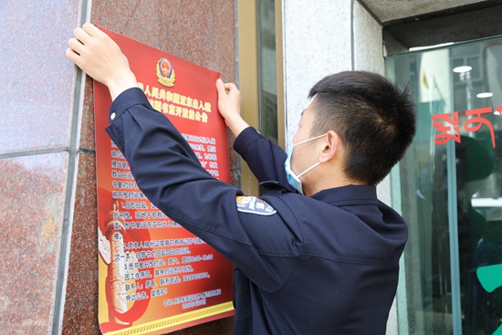亞東出入境邊防檢查站民警在縣主要街道張貼圖書室開放公告。張雨強 攝