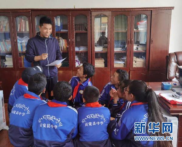 陳洪順向西藏自治區(qū)昌都市貢覺縣中學的學生們講授經(jīng)典誦讀技巧(2020年6月22日攝)。新華社發(fā)