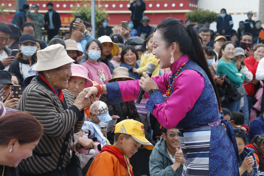 德西美朵在下鄉(xiāng)演唱時(shí)和群眾互動(dòng)。新華社發(fā) (受采訪者供圖)
