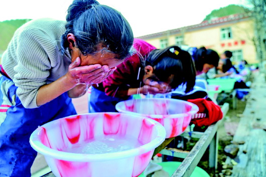 4月30日,在類烏齊縣桑多鎮(zhèn)第二小學(xué),學(xué)生們用熱水洗漱。這套熱水設(shè)施由李純民發(fā)起的“齊興”助學(xué)獎勵基金捐助?!∮浾邉⒔鸷!ⅫS臻攝