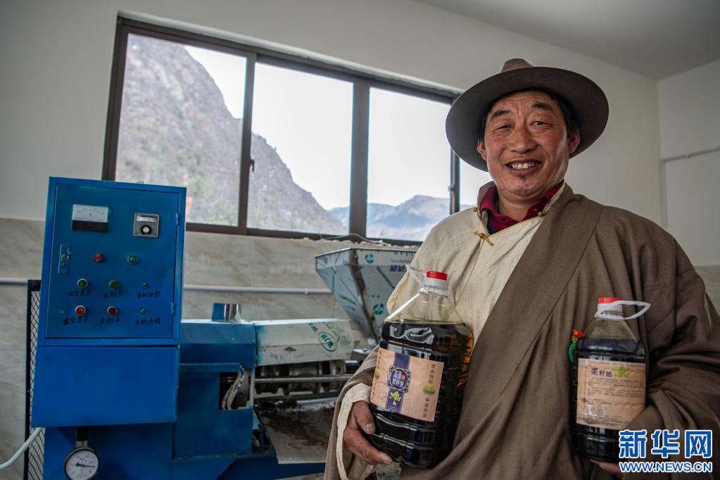 2021年3月23日,在昌都市江達縣崗?fù)墟?zhèn)崗?fù)写宓那逵图庸S,永紅在展示清油產(chǎn)品。新華社記者 孫非 攝
