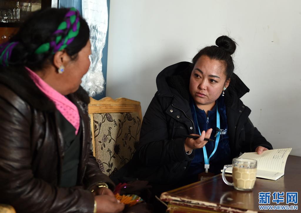 2018年3月6日,拉薩市曲水縣委宣傳部副部長、才納鄉(xiāng)四季吉祥村黨支部第一書記索朗央吉(右)與村民商量編制規(guī)劃。新華社記者 覺果 攝