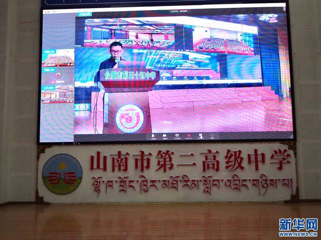西藏山南市第二高級(jí)中學(xué)的學(xué)生坐在階梯教室中,屏幕的另一端是安徽省合肥市第三十五中學(xué)的同學(xué)們。借助網(wǎng)絡(luò)傳輸技術(shù),皖藏兩地實(shí)現(xiàn)思政課教學(xué)資源跨越上千公里的互聯(lián)共享,創(chuàng)新了思政課的形式。