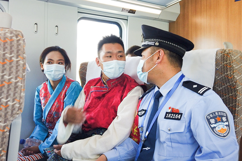 拉薩鐵路公安處乘警支隊民警在“復(fù)興號”動車組開展值乘工作。胡傳鑫 攝