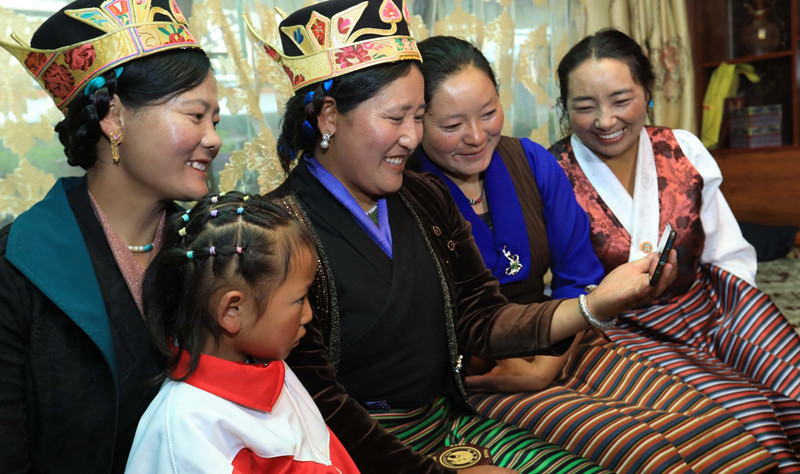 西藏自治區(qū)拉薩市墨竹工卡縣群眾通過手機收看慶祝大會。記者 洛桑 次旺 唐斌 潘多 攝
