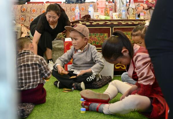 在日喀則市郊區(qū)的一個(gè)度假村,家長(zhǎng)帶孩子在帳篷里“過(guò)林卡”(2019年6月23日攝)。新華社記者 張汝鋒 攝