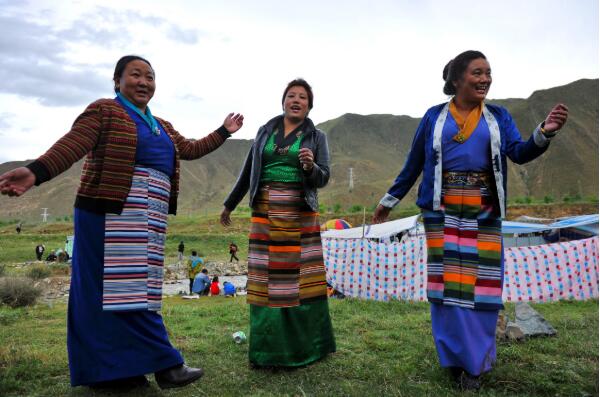 在拉薩東郊的小河邊,“過(guò)林卡”的婦女跳起歡快的舞蹈(2015年9月13日攝)。新華社記者 張汝鋒 攝