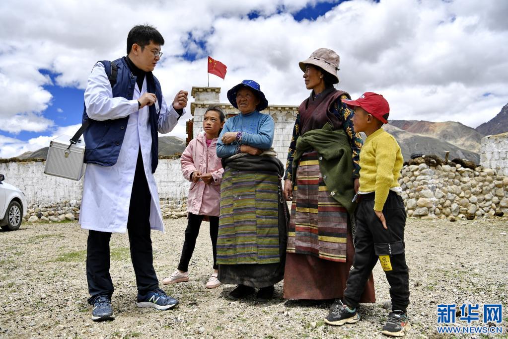在拉薩市當(dāng)雄縣格達(dá)鄉(xiāng)格達(dá)村,前來義診的王克明(左一)為村民講解健康知識(shí)(6月19日攝)。新華社記者 張汝鋒 攝