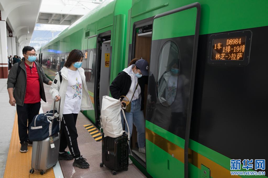 在林芝火車站,乘客們登上火車(7月26日攝)。新華社記者 金立旺 攝