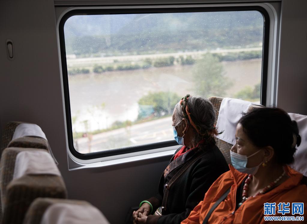 家住山南的扎桑(右)帶著75歲的母親洛桑卓瑪去林芝旅游,這是她母親第一次坐火車出行(7月26日攝)。新華社記者 金立旺 攝