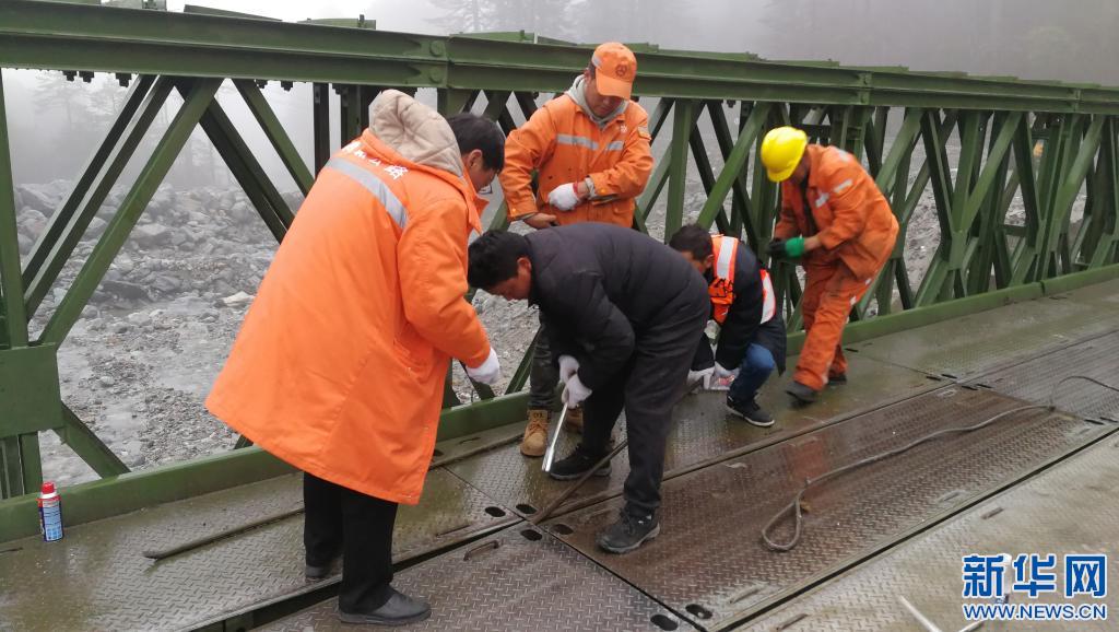 湯剛旦(左)和同事在扎墨公路上執(zhí)行道路養(yǎng)護任務(wù)(5月13日攝)。新華社發(fā)