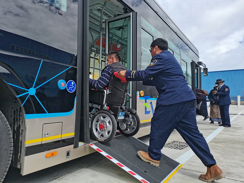 3日,拉薩市公交運營有限公司舉行拉薩公交經(jīng)開區(qū)B區(qū)公交首末站啟用暨大站快線開通儀式?,F(xiàn)場,坐在輪椅上的市民覺列準備乘坐新公交車,駕駛員接到乘車提示后,采取制動措施,將車輛熄火后來到后門處,將無障礙踏板翻開并固定好,順利幫其上車。