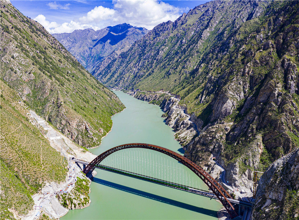 6月17日,試運行的復(fù)興號列車行駛在川藏鐵路拉林段藏木特大橋(無人機照片)。新華社記者 普布扎西 攝