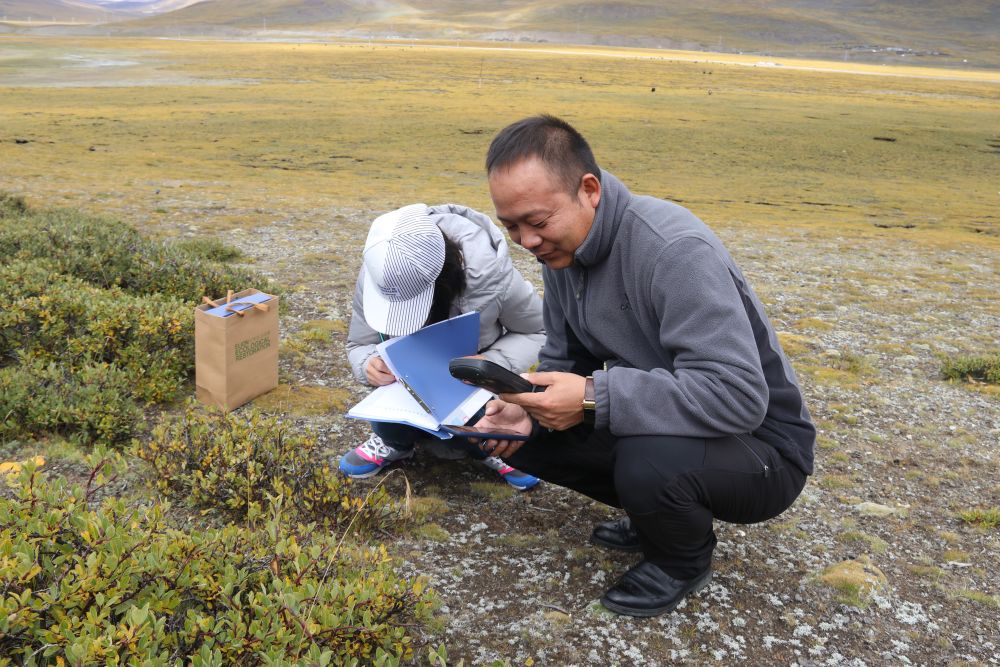 郝偉(右)和團(tuán)隊工作人員在野外采集植物樣本數(shù)據(jù)。受訪者供圖