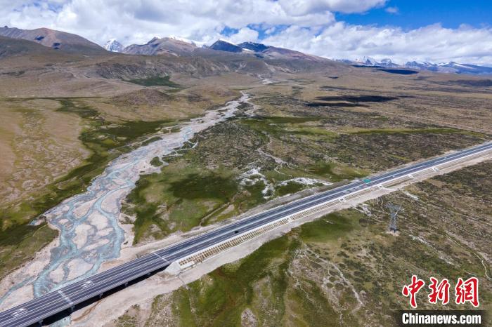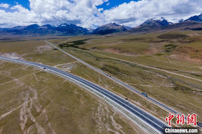 那拉高速(畫面下方)、青藏公路和遠(yuǎn)處的雪山?!〗w波 攝