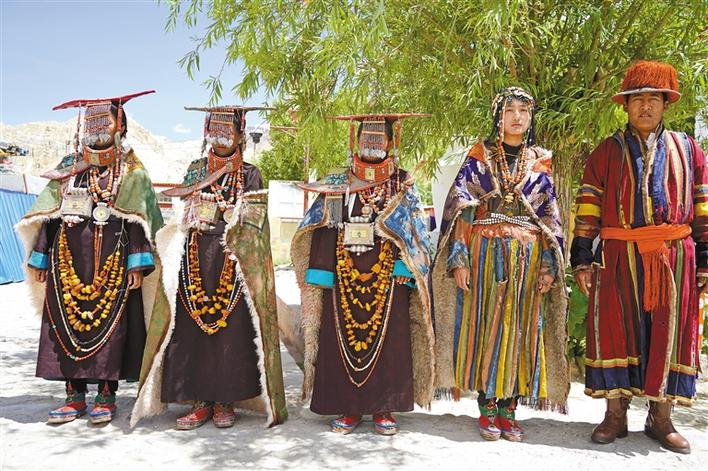 巴桑歐珠介紹,目前,科迦村保存有8套科迦服飾,也有人叫這種服飾為“飛天服飾”,其中,以婦女的“孔雀服飾”最為昂貴。這種服飾價值幾十萬元甚至數(shù)百萬元的主因是其多用黃金、白銀、松石、瑪瑙、珊瑚、琥珀、珍珠、田黃等金銀珠寶鑲嵌裝飾,每套服飾承載和沉淀著千百年的文化。