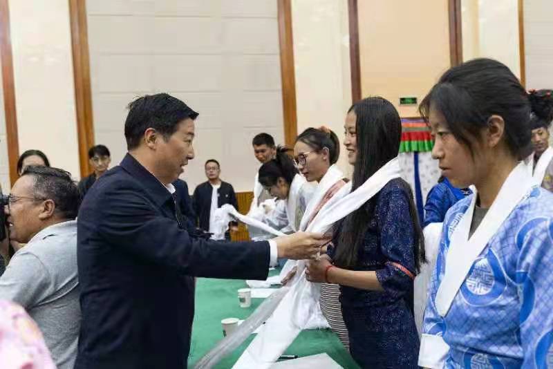 10月14日下午,湖北省第九批援藏工作隊(duì)領(lǐng)隊(duì)、山南市委副書記、常務(wù)副市長(zhǎng)李修武為即將赴湖北就業(yè)的大學(xué)生獻(xiàn)哈達(dá)。(通訊員 羅洋 攝)