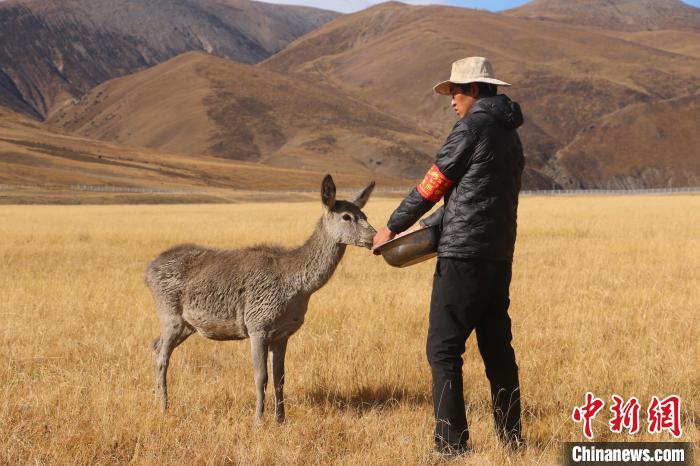 圖為西藏類烏齊馬鹿國家級自然保護(hù)區(qū)的管護(hù)員正在飼喂馬鹿。冉文娟 攝