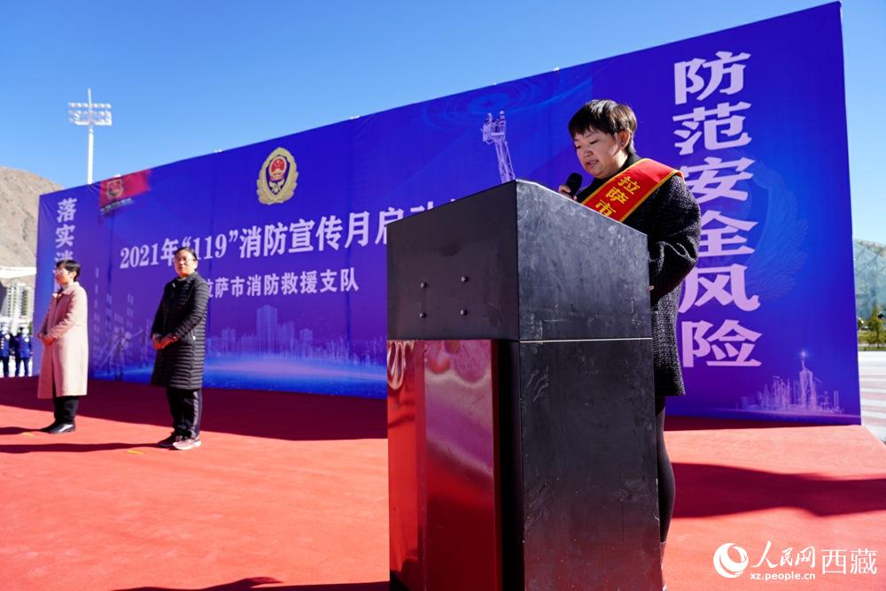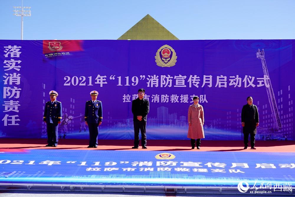 拉薩市2021年“119”消防宣傳月啟動儀式現(xiàn)場。拉薩市委常委 、常務副市長占堆(左三)出席儀式并講話。人民網 次仁羅布攝