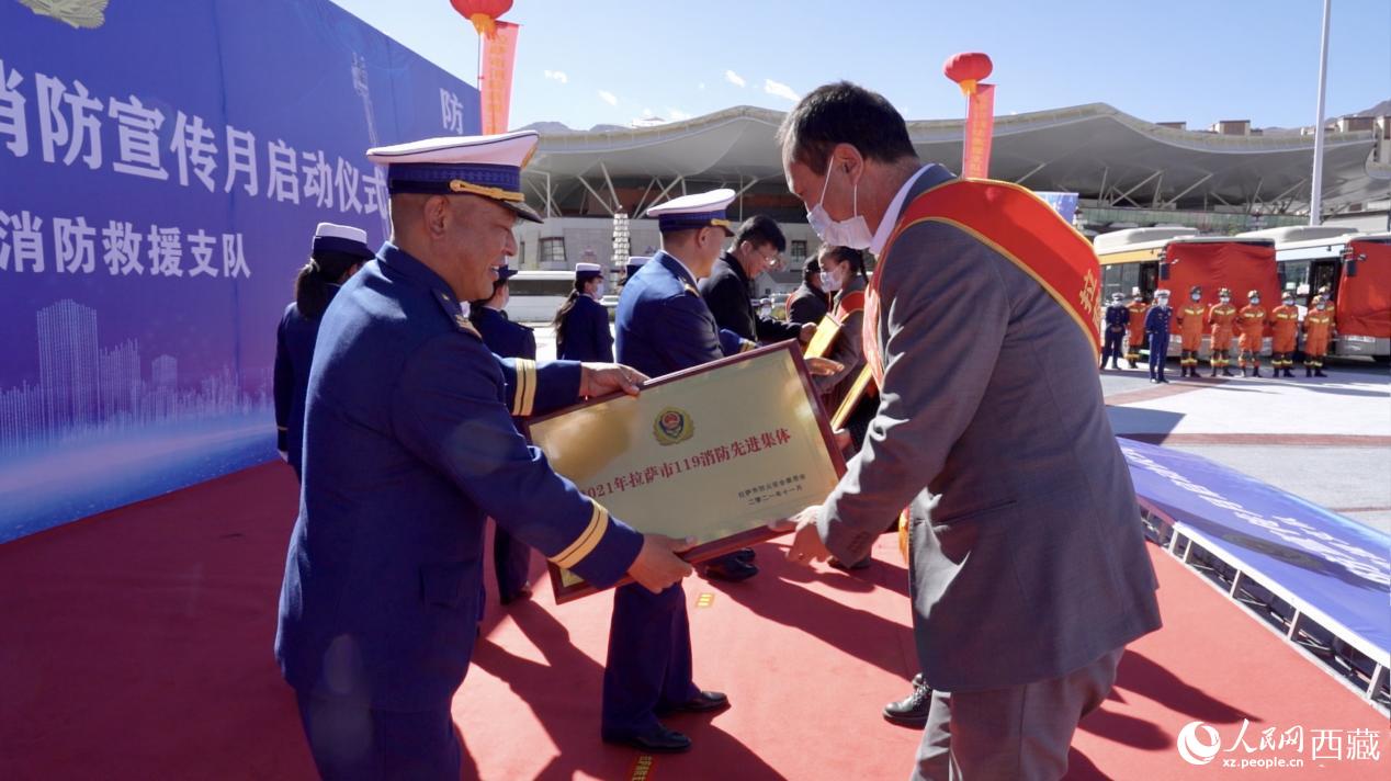啟動儀式上,表彰了2021年度拉薩市“119”消防先進集體、先進個人。與會領導為受表彰的單位及個人代表頒發(fā)證書。