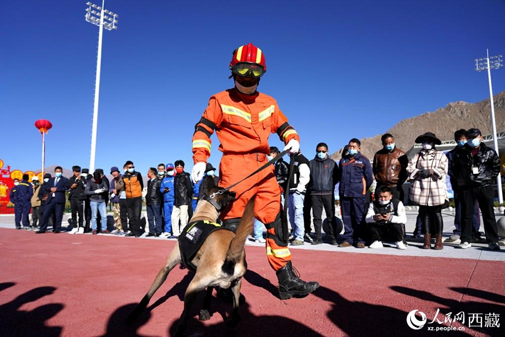 搜救犬現(xiàn)場演練。人民網 次仁羅布攝