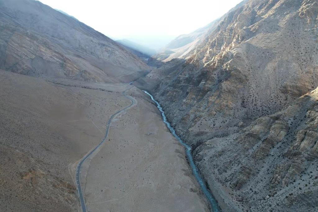 離開參木達(dá)村,沿扎嘎曲逆流而上行駛約20分鐘后,公路旁的扎嘎曲開始在峽谷中東西向蜿蜒而行,進(jìn)入整條河流的最狹窄處。記者在S516省道29公里處停車航拍,只見公路與河流像兩條平行的曲線,時(shí)遠(yuǎn)時(shí)近,向遠(yuǎn)方延伸。