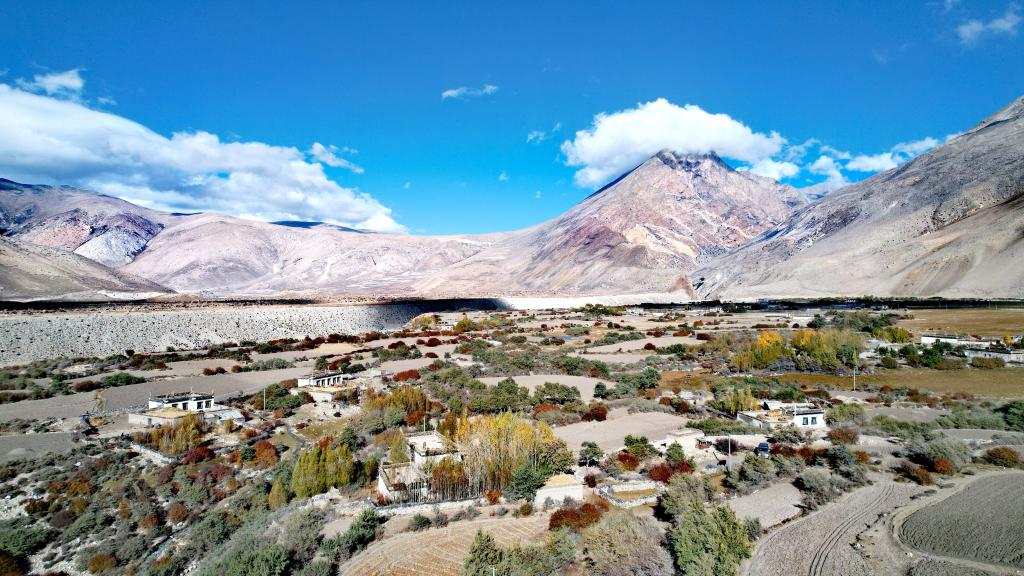 十月下旬,記者驅(qū)車來(lái)到曲當(dāng)鄉(xiāng)參木達(dá)村。透過(guò)航拍中的無(wú)人機(jī)遙控器顯示屏,記者看到,藏式民居在秋色浸染的樹木映襯下錯(cuò)落有致,秋日照耀下色彩斑斕,村東有巍峨的雪山、村西是奔騰南去的河流。