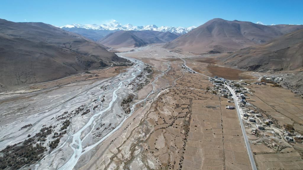 最寬闊處的扎嘎曲。圖的上方為珠峰,右邊為巴松村。新華社記者劉詩(shī)平攝