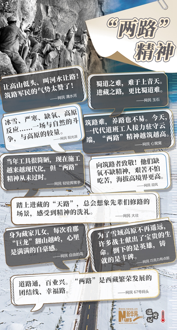 “天路”巍峨,精神閃光。當(dāng)雪域高原換了人間,新一代建設(shè)者正接過(guò)接力棒,在新時(shí)代續(xù)寫著新的傳奇。“今天,一代代道班工人接力駐守云端,‘兩路’精神越筑越高”,正如網(wǎng)民所說(shuō),無(wú)論過(guò)去、現(xiàn)在和將來(lái),“兩路”精神都是西藏各族人民建設(shè)幸福家園的力量源泉和精神動(dòng)力,也必將激勵(lì)中華兒女為了更加美好的明天繼續(xù)奮斗、前行。(文字:馬若虎 海報(bào)設(shè)計(jì):王曄)