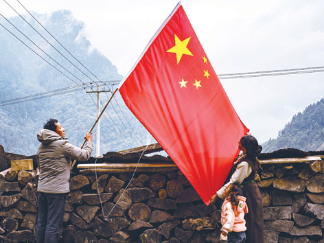 陳塘鎮(zhèn)居民尼瑪(右)和家人懸掛國旗(11月25日拍攝)。普布扎西、格桑邊覺、孫瑞博攝