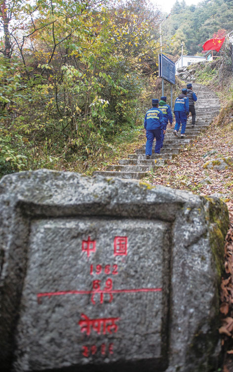 夏爾巴巡邊員們沿著中尼邊境巡邏時經(jīng)過界碑(11月24日攝)。普布扎西、格桑邊覺、孫瑞博攝