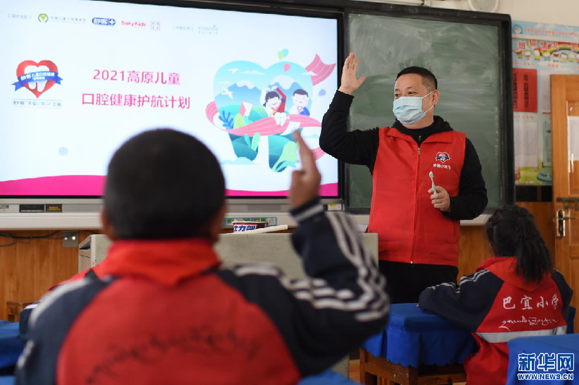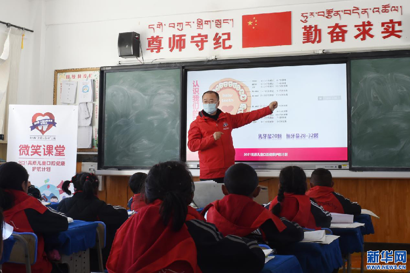 12月17日,薇美姿集團(tuán)聯(lián)合創(chuàng)始人余立濤為學(xué)生們講解口腔健康知識(shí)。新華網(wǎng) 旦增努布 攝
