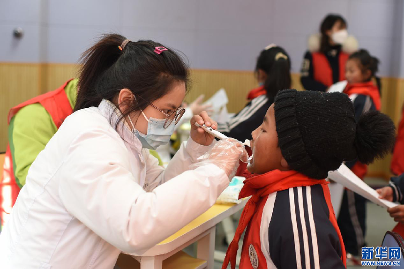 12月17日,來自青苗兒童口腔的醫(yī)生為學(xué)生進(jìn)行口腔健康檢測(cè)。新華網(wǎng) 旦增努布 攝
