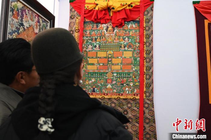 圖為唐卡愛(ài)好者欣賞唐卡展品。趙朗 攝